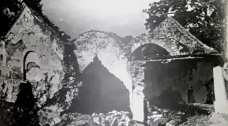In 1942, during the Second World War, as part of Operation Kopaonik, members of the 7th SS Volunteer Mountain Division Prinz Eugen and Bulgarian soldiers, against the commands of Richard Kaaserer,[3] imprisoned 46 men, women and children in the church on 12 October 1942.[4] The troops subsequently shot the prisoners and put their bodies back inside, after which they blew the church up.[5][6][7] The church was not completely destroyed, with most of the walls surviving, together with part of the frescoes. The church required some of its walls rebuilt with plaster, which contrasts its original cobblestone exterior.