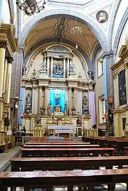 Its dome is decorated with tiles laid in a strip design and made to look like rebozos, a type of indigenous shawl.[1] Inside, the original Baroque altar is long gone, replaced with the current Neoclassic altar.[2] Mexican painters Miguel Cabrera and José de Ibarra are interned in altar here.[4]