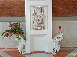 Following the suppression of religious orders in 1809, the following year the main Baroque furnishings of the church of St. Catherine were moved elsewhere at the behest of Vicar General Giuseppe Iannitti. The high altar, attributable to Domenico Antonio Vaccaro and dating back to 1705,[26] was transferred to the church of St. Anthony Abbot together with its retablo and related altarpiece, a painting by Pietro Novelli depicting the Mystic Marriage of St. Catherine of Alexandria between Saints Augustine and Benedict, defined by Camillo Guerra as the work of Pietro Novelli, although the academic himself likens it to the style of Correggio.[28] The church, which in 1838 became the seat of the parish of San Biagio, popularly assuming its name, suffered minor damage during World War II but was demolished in 1957 by the municipal administration for the opening of the Giovanni Caboto waterfront.[56] Of the building, only the back wall of the apse was preserved along with the marble altarpiece (the canvases, however, were lost); the latter is articulated in a large central cornice supported by corbels, framed by a pair of composite pilasters and surmounted by a broken curvilinear tympanum, on either side of which are two smaller ones, each of which is decorated with an antefix (the present ones are the result of reconstruction, since the originals were stolen at the end of the 20th century);[57] above the cymatium is the Dove of the Holy Spirit in the round, while below it is a cartouche with three angel heads and festoons. The mensa and the elevation, on the other hand, were dismembered: the tabernacle and the two altar-head angels were taken to the church of St. Paul the Apostle in Gaeta, and reassembled there to form a side altar; the remaining parts, however, found lodging in the church of San Magno near Fondi, from which they were later alienated. The tabernacle echoes, in its decorative apparatus, the subjects of the altarpiece: above the small arched doorway, in fact, are three angel heads, while higher up there is, against a background of clouds in relief, the dove of the Holy Spirit, partly mutilated; the entire piece is ornamented with scrolls and inlays; the altar-head angels had their feet amputated to facilitate their relocation.[58]