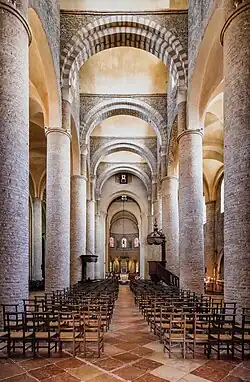 The nave is roofed with barrel vaulting, supported on tall cylindrical columns. The barrel vault is unusual in that it is transversal: instead of one long barrel running along nave, the vault consists of multiple smaller barrels running across the nave. This arrangement helps the engineering by avoiding lateral thrust but it "is not beautiful and was never repeated."[3]