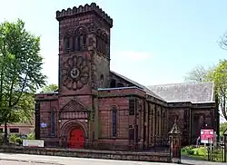 The church is built in ashlar stone with a slate roof in Norman Revival style.[1][3] Its plan consists of a west tower flanked by a baptistry to the north and a stair bay to the south, a four-bay nave, north and south transepts, and a three-bay chancel with the organ loft to the north and a vestry to the south. The round-headed entrance is in the base of the tower with blind arcading and a diapered gable above it. Over this is a clock face surrounded by a large rose motif. The tower has paired two-light bell openings on each face over which is a cornice with corbels and a parapet with blind arcading.[1] The east window consists of three lancets and a rose window. The west gallery is still present as are the galleries in the transepts.[3]