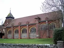 The Church of St Birinus is built of local red brick, with a tiled roof, and dressings in Bath stone. Designed for 160 persons, it is made up of a nave, chancel, organ chamber and west baptistery, the latter having a north vestry and south porch. There is a west tower with a louvred bellcote containing one bell. A hipped gablet above one of the buttresses contains a statue of St Birinus, which was modelled in clay by Miss. A. M. Palmer.[6][2]