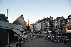The modern church Sainte-Jeanne d'Arc and the adjacent market halls were designed by the architect Louis Arretche,[3] who was commissioned in 1969.[4] The sweeping curves of the structure are meant to evoke both the flames that consumed Joan of Arc and an overturned longship. Many early Christian churches were designed in the shape of an overturned boat. The market halls simultaneously resemble smaller overturned boats and fish with gaping mouths, which are also rich Christian symbols. The tiled roof echoes this theme and forms a covered walkway over the square.[4]