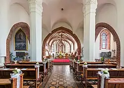 The restoration work initiated by Tumas-Vaižgantas was not completed until 1990. In 1978, under the direction of the architect Stefanija Čerškutė, work continued on the architectural survey and partial restoration of the building. Based on an image of the church in a 17th-century engraving by Tomasz Makowski, the tower spire was restored in 1982. During the restoration works, a new organ was installed and the vestibule of the sacristy was added. In 1990, the interior of the church was subject to significant changes, including the installation of a polished stone floor in the chancel and the addition of a new altar table. Unfortunately, the oldest original interiors of the church, dating back to the Gothic, Renaissance and Baroque periods, have not survived. The decor and furnishings of the current interior date from the 1920s.[3]