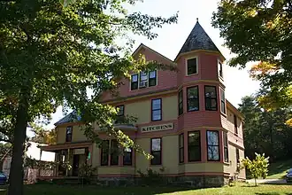 The Cicero Goddard Peck House stands in the village Hinesburg, on the south side of Mechanicsville Road just east of its junction with Vermont Route 116. It is a 2+12-story wood-frame structure, basically L-shaped, with a main block whose gable is perpendicular to the road, and a side ell with a cross gable. A single-story porch is set at the crook of the ell, and a polygonal three-story tower projects from the front right corner. The exterior is finished in a combination of wooden clapboards and scallop-cut shingles, and there is a projecting single-story polygonal bay on the front facade. The porch is supported by turned posts and has a balustrade with square balusters. The interior of the house retains many original period finishes and features, including pocket doors, a China cabinet in the dining room, and original moulding and floors.[2]
