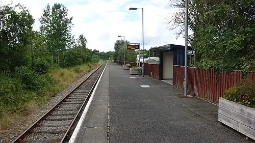 The station is unstaffed (like almost all others on the line), with a single active platform and basic amenities (CIS display, help point and timetable information board). Step-free access is provided from the station entrance to the platform, though the access path is unmade and somewhat uneven.[1]