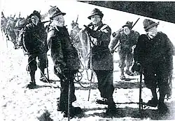 The invasion of Ethiopia gives Italian directors the opportunity to extend the horizons of the settings.[82] The Great Appeal (1936) by Mario Camerini, exalts imperialism by describing the "new land" as an opportunity for work and redemption, contrasting the heroism of young soldiers with bourgeois fearlessness. The anti-pacifist controversy that accompanies colonial enterprises is also evident in Lo squadrone bianco (1936) by Augusto Genina, which combines propaganda rhetoric with notable battle sequences shot in the Italian Tripolitania desert. Most of the films celebrating the empire are predominantly documentaries, aimed at disguising the war as a struggle of civilization against barbarism. The Spanish Civil War is described in the documentaries Los novios de la muerte (1936) by Romolo Marcellini and Arriba España, España una, grande, libre! (1939) by Giorgio Ferroni, and is the backdrop for another dozen films, among which the most spectacular is The Siege of the Alcazar (1940) by Augusto Genina.[81]