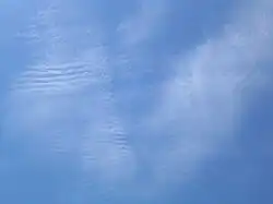Cirrocumulus undulatus is a variety of cirrocumulus cloud. The name cirrocumulus undulatus is derived from Latin, meaning "diversified as with waves".[1] They have a rippled appearance due to wind shear and usually cover only a small portion of the sky. They appear in bands as small patches or layers. Occasionally, they comprise two or more wave forms superposed upon one another.[2] The individual cloudlets can either be circular or elongated in the direction of the rows.[3]