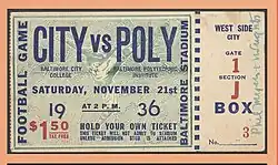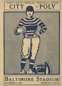 The City–Poly football rivalry, also referred to as the "City-Poly Game" is an American football rivalry between the Baltimore City College Black Knights (City) and the Baltimore Polytechnic Institute Engineers (Poly). This matchup is the oldest football rivalry in Maryland.[1] The rivalry is believed to be the second-oldest high school football rivalry in the United States between public high schools, predated only by the English High School of Boston-Boston Latin School football rivalry, which started two years earlier in 1887. The rivalry began in 1889 and the teams have met 136 times in history. City College leads the series 67–62–6.[2][3]