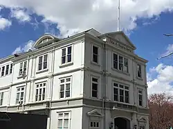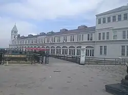 The eastern or inshore end of Pier A was constructed in 1900 as a square two-story annex, which was expanded to three stories in 1904.[19][20] It extends about 50 ft (15 m) inland.[6][20] The inshore annex's facade is divided vertically into three bays each on its northern, eastern, and southern elevations.[19] The bays are divided by one-story pilasters, and a cornice runs above the third story.[20] The eastern elevation includes a large archway on the ground floor (originally used by horse-drawn carriages), which is flanked by smaller openings with architraves. On the second and third stories of the eastern elevation, there is a triple window in the center bay and a single window on either side.[19] Above the third story, the center bay contains a triangular pediment with seashell decorations, originally decorated with the letter "A".[6][19][20] On the northern and southern elevations, the inshore annex has a double window in each bay, as well as a segmentally arched pediment at the center above the third story. The inshore annex is topped by a gable roof.[20]