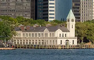 Pier A, also known as City Pier A, is a pier in the Hudson River at Battery Park in Lower Manhattan, New York City. It was built from 1884 to 1886 as the headquarters of the New York City Board of Dock Commissioners (also known as the Docks Department) and the New York City Police Department (NYPD)'s Harbor Department. Pier A, the only remaining masonry pier in New York City, contains a two- and three-story structure with a clock tower facing the Hudson River. The pier is a New York City designated landmark and is listed on the National Register of Historic Places (NRHP).