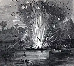 Alfred R. Waud's illustration of the explosion of the barge J. E. Kendrick at City Point on August 9, 1864, published in Harper's Weekly on August 27, 1864