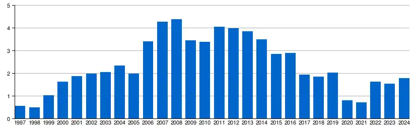 The redevelopment enabled an increase in passenger numbers from a few thousand a year, to a peak of 438,996 in 2008. The airport experienced a decline in passenger numbers in 2009-21, partially due to the COVID pandemic and underfunding, and reached a low of 73,024 in 2021. Passenger numbers then partially recovered, and in 2024, 179,095 passengers used the airport.