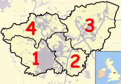 A map of South Yorkshire, showing the Metropolitan Boroughs: (1) Sheffield; (2) Rotherham; (3) Doncaster; and (4) Barnsley.
