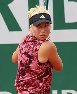 At the opening of the clay-court season in April, she was seeded for the first time on the WTA Tour at the Copa Colsanitas.[42] However, she lost to qualifier Daniela Seguel, in the first round.[43] Her next competition was the WTA Charleston 2 event. She reached the quarterfinals but had to retire against Camila Osorio, because of a knee injury.[44][45] The injury prevented her from participating in the WTA 1000 Madrid Open. Instead, she participated in the Open de Saint-Malo in both singles and doubles. While she was eliminated early on in the singles, she managed to reach the semifinals in doubles with her partner Aliaksandra Sasnovich from Belarus.[46][47] In May, she entered the main draw of the French Open, losing to Viktoria Azarenka in the second round.[48]
