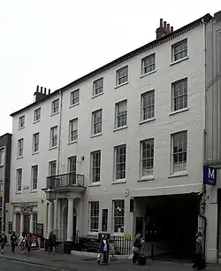 Clarence House, previously the New Inn (1785–1830) and the Clarence Hotel (1830–1972), is a former coaching inn and hotel in Brighton, part of the English coastal city of Brighton and Hove. The only surviving coaching inn of many which used to stand on North Street, Brighton's main commercial thoroughfare, it retains much of its original "severely plain"[1] Georgian appearance, with Classical features and mathematical tiles; but the interior has been changed since its closure in 1972 and conversion into a mixed-use commercial building. The four-storey structure, which is in a conservation area and which has been listed at Grade II by Historic England for its architectural and historical importance, is empty and has been vandalised and squatted repeatedly, but planning applications were raised in 2021 and 2022 for the creation of two flats and a new restaurant within the building.