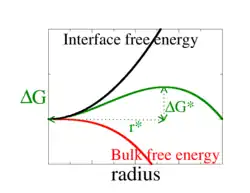 To understand if nucleation is fast or slow, , the Gibbs free energy change as a function of the size of the nucleus, needs to be calculated. The classical theory[10] assumes that even for a microscopic nucleus of the new phase, we can write the free energy of a droplet as the sum of a bulk term that is proportional to the volume of the nucleus, and a surface term, that is proportional to its surface area