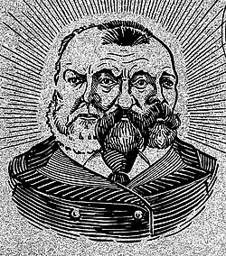 During October and November 1903 Marquet's regular page-one feature cartoon was absent from The Tocsin, though the issue of 26 November included a double-page cartoon as a supplement, 'Symeism Versus Democracy', notated with "Drawn on zinc and etched by C. A. Marquet".[38] By mid-December 1903 Marquet's regular cartoons had resumed, appearing regularly until early May 1904 (but only occasionally after that).[39][40]