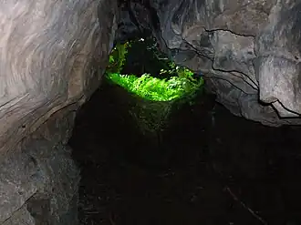 The cave system was formed in Dusk Glen when the waters of the Dusk (Dubh-Uisge, Gaelic for 'black water')[11] ran through and eroded the limestone, followed by a period when it was relatively dry allowing the stalactites and stalagmites to form and finally a progressive infilling with soil washed in from above, resulting in a partial infilling of the caves and passageways; at this point John Smith obtained permission from Captain Blair, R.N., of Blair House to explore and ultimately remove some 300 tons of material.[12] The cave now lies 40 feet (12 m) above the Dusk Water due to the excavation of the gorge by the river. Near the middle is a spacious chamber, 35 feet (11 m) long by 27 feet (8.2 m) broad and 12 feet (3.7 m) high. The internal surfaces of the chambers and passageways are covered with calcareous incrustations and numerous crevices branch off in all directions. It was regarded in Victorian times as one of the greatest natural curiosities in Ayrshire.[7]