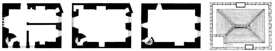 The tower measures 33 ft (10 m) by 26 ft (7.9 m), with red sandstone walls around 3 ft (0.91 m) thick and 37 ft (11 m) high.[21] The ground floor was originally the parlour, with a carved wooden ceiling and a fireplace, with doors leading externally and into the hall.[22] Originally, the stairs did not reach down to the ground floor.[23] The first floor formed the principal chamber in the tower, accessed from stairs in the hall; it had a fireplace, a garderobe and its walls would have been plastered and painted, with wood panelling.[24] Stairs led up to the second floor, again equipped with a fireplace and wood panelling, and up onto the roof.[25]