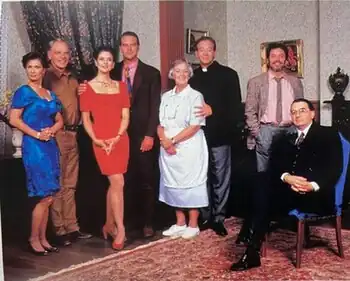 Cluedo features a regular cast of six characters who return each week to stand accused of the murder of a visitor.[57] Mrs. White actress Joy Westmore noted that the premise relies on "the same characters returning week after week" with a blank slate and "pretending nothing happened the week before".[8] She added that "no-one is ever hauled off to jail" or acknowledges that just days earlier they had been found guilty of murder.[8] The Age agreed that "each week the slate is swept clean" and that "any indiscretions that may have been committed the previous week are ignored, and the story starts anew".[46] McFadyen noted, "I think you have to imagine that all these actors are packed up and put back into their box and brought out to play with again next week – so there's this lovely renewal".[11] Dundee Courier noted that each actor is cast as either the "goodie" or "baddie" based on the specifics of each murder.[82]