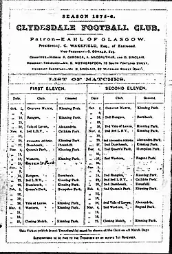 The club was formed in 1872, in the wake of the Queen's Park. In 1873, Clydesdale was one of the teams to found the Scottish Football Association, with the club's Archibald Campbell being appointed president,[2] and made a generous donation of £5 towards the cost of the Scottish Cup.[3] This was more than any team other than Queen's Park, which had a much larger membership (103 to Clydesdale's 30 at the time).[4]