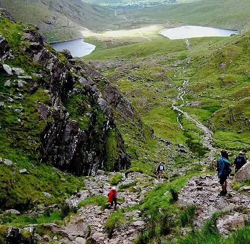 Cnoc na Toinne is most frequently encountered as the minor summit that forms the col with Carrauntoohil, through which most hill walkers travel on their way summiting Ireland's highest mountain. The col is most commonly accessed from the Hag's Glen (via Cronin's Yard), by ascending a loose rocky path known as the Devil's Ladder (see photo opposite).[b][4][5]