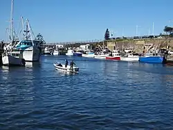 The mouth of the Hunter was difficult for sailing ships heading south to Sydney. Sailing ships leaving port could not negotiate the east-north-east facing channel leaving the river, when winds favourable to a southern passage were blowing. From 1859, these ships were towed out by steam tugs and the situation improved.[43] The construction of the breakwater and land reclamation between Nobbys Head and Newcastle increased the safety of the port.