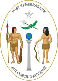 1813—1814 | The first arms depicted a doric column with a globe at its top, with a native man and woman as supporters, a wreath, a halbert, a star and the two mottoes in Latin Post tenebras lux and Aut consilio aut ense. | ![]()