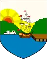ShieldQuarterly Or and Azure a cross fillet counterchanged in the first quarter on a Rocky Mount Sable a Coconut Tree fructed proper in the second a Dominica Crapaud also proper in the third on Water Barry wavy in base a Carib canoe with sail set all likewise proper in the fourth quarter on a Rocky Mount also sable a Banana Tree fructed also proper