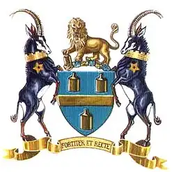 In May 1939, the College of Arms granted a crest (a gold lion resting a paw on a battery stamp) and supporters (two sable antelope, each with a gold mural crown around its neck and a gold star on its shoulder).[2] The full achievement of arms was registered with the Transvaal Provincial Administration in November 1951[3] and at the Bureau of Heraldry in November 1966.