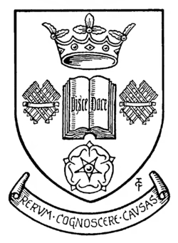 Below the azure shield is a scroll that carries the Latin motto Rerum Cognoscere Causas ("To Discover the Causes of Things"), which was also used by Firth College, the predecessor of the University of Sheffield.[5] The motto comes from verse 490 of Book Two of the Georgics by poet Virgil.[6]