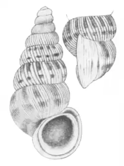 The shell is light greyish brown with 3 rows of reddish brown spots.[4] It has 6-8 regular ribs/mm and 7-10 convex whorls.[4] The aperture is inside whitish.[4] There is no significant sexual dimorphism on the shell.[4]