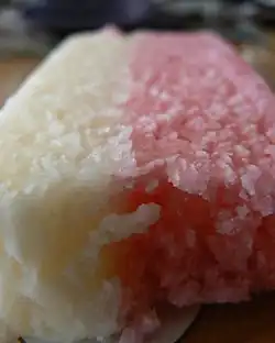 Coconut ice (sometimes Cocoanut ice)[1] is a British confectionery prepared using grated desiccated coconut or just grated coconut, condensed milk and sugar, which is formed to create a solid, soft candy.[2][3][4] It typically has a chewy, soft and mildly grainy texture;[5][4] some versions are semi-hard.[2] Coconut ice is also available in South Africa,[6] some areas of Australia,[7] and New Zealand.[8]