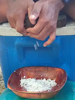 Coconut milk is traditionally made by grating the white inner flesh of mature coconuts and mixing the shredded coconut pulp with a small amount of hot water in order to suspend the fat present in the grated pulp.[1] The grating process can be carried out manually or by machine.[1][12] Polynesians may use special bundles of fibre from sea hibiscus, heliconia or the coconut itself called tauaga to wring the milk from the meat.[13][14]