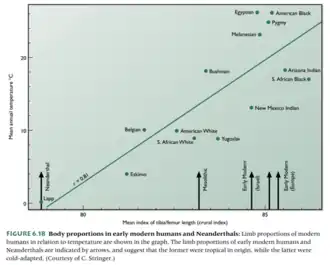 Paleoanthropologist John F. Hoffecker found that both Bermann's and Allen's biogeographical rules were confirmed, with it being seen that in modern populations, there is a clear trend of shorter distal limb segments in colder environments.[15]