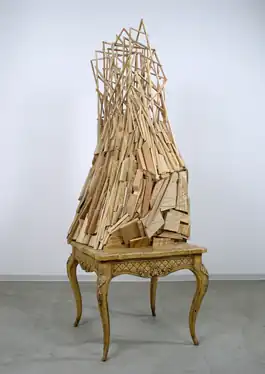 Sterritt began incorporating found furniture and recognizable objects in her work in the 2000s, subverting the "form follows function" dictum in witty, "towering agglomerations" that suggested plants, animals or hybrids (e.g., Daddy-O,[46] 2006).[26][27][47] Her process has been described as resembling a "three-dimensional journal" with each decision and part "unusually transparent," the latter category creating a split mindset in viewers between the integrated sculptures and the disparate, often recognizable, components.[6] The juxtaposition of mass-produced and natural objects opened her work to unpredictable narratives and metaphors investigating the uneasy balance between nature and the built environment in works like One & Nine & Five & Three[48] (2004–05) or Diagramme de Navigation de Mon Coeur (2005), which was described as a "Tatlinesque tower" whose "organic nervous geometry"[21] seemed a meditation on male/female relationships and the flawed promises of modernist utopianism and consumerist comfort.[1][26][6][15]