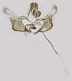 The wingspan is 10–15 mm. The moth's head is white, as are the antennae which are ringed with pale brownish. It has a basal joint with rather short tuft. The labial palps and forewings are also white. The veins are faintly yellowish-tinged, near apex more fuscous; costal edge anteriorly finely dark fuscous, near apex more strongly; costal cilia fuscous or dark fuscous except at base and tips. Hindwings rather dark grey.[2] Keys and description [3] Only reliably identified by dissection and microscopic examination of the genitalia.