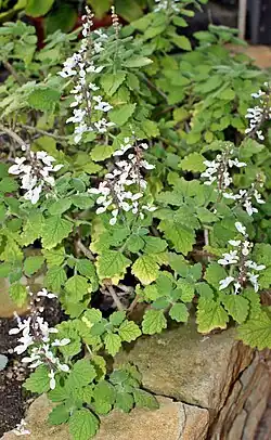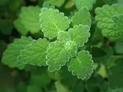 The dark green leaves are broadly ovate with 3-7 pairs of rounded teeth, somewhat hairy both above and below and 35-40 mm in length. The cultivar 'Lynne' features variegated leaves that have splashes of creamy-white to pure white margins on them.[2][4] Crushed leaves create an oregano-like aroma.[5]