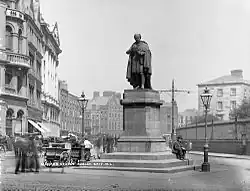 The Crampton Memorial was constructed in 1862 on a site in the centre of the eastern (Pearse Street) end of College Street. It partially collapsed in 1959 and was subsequently demolished.[2] There is now a sculpture at the eastern end, named "Steyne" after an Old Norse word meaning "stone". It was created by Cliodhna Cussen and installed in 1986.[2] At the western end there is a statue of composer Thomas Moore, erected in 1857 by Christopher Moore.[11]