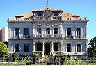 The rectangular building with basement is two stories with a mansard roof.[1] A simple plan, the principal facade (oriented to the Avenida da Boavista) includes a porch fronted by a staircase and defined by balustrade in granite.[1] Flanking this portico are windows on the ground and second floors framed in granite and curved lintels.[1] On its rear profile, the building is marked by a slender and aligned aperture, while the side elevations, equal to one another, features a ground floor with four windows and an upper floor with balcony doors.[1] The surfaces have a continuous cornice in granite with closed areas with vases, interrupted the main facade in the center by a small backrest surmounted by a perfect arch back inscribed with the monogram BRS.[1]