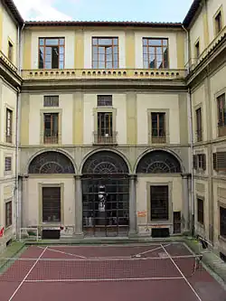 Originally, a convent, there were many houses belonging to various families, including the Martelli and Gori Ciampellis. On the side of Piazza San Marco it was the House of Medici. In 1557, the church and the annexed houses were granted to the Jesuits who erected the convent and enlarged the church. Once the Jesuits were suppressed, it was given to the Piarist Fathers who established their college there.[1] Without prejudice to the close link between this building and the nearby church of San Giovannino, it can be identified in particular as the date of origin of the current complex in 1554, when part of this area was granted by Cosimo I de' Medici to the Jesuits to found a college there. They entrusted the design to Bartolomeo Ammannati so that, even before the construction of the church, in 1579, part of the building could be considered defined. However, various obstacles did not allow the completion of the works which, having remained interrupted for many years, only resumed in 1620 based on a project by architect Giulio Parigi.