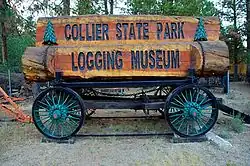 Collier Memorial State Park features the Collier Logging Museum, an outdoor museum with a large collection of historic logging equipment. Some items date back to the 1880s and many are quite rare. The collection includes ox drawn "high wheels" used to raise the forward end of logs off the ground so they could be skidded through the forest to a collection area. Steam-powered "donkey engines" used steel cables to haul logs to a collection point. There are also steam tractors and diesel "cats" that performed the same function in their turn. The most modern piece of logging equipment on display is a Beloit tree harvester. The harvester, operated by one person, cuts trees near ground level using hydraulic blades, removes the limbs, and stacks the logs onto a logging truck all in one continuous operation.[3]