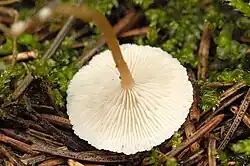 The spore print is white.[19] Individual spores are smooth, ellipsoid to tear-shaped in profile, obovoid to ellipsoid or cylindric in face or back view, with dimensions of 4.2–6.2 by 2.8–3.5 μm. They are inamyloid and acyanophilous (non-reactive to staining with Melzer's reagent and Methyl blue, respectively). The basidia (spore-bearing cells in the hymenium) are club-shaped to cylindric and 15.4–21 by 3.5–5 μm. The cheilocystidia (cystidia on the gill edge) are scattered to infrequent, inconspicuous, and 17.5–31.5 μm long. Their shape ranges from a contorted cylinder to roughly club-shaped to irregularly diverticulate (with short offshoots approximately at right angles to the main stem). There are no pleurocystidia (cystidia on the gill face). The gill tissue is made of interwoven hyphae that are non-reactive to Melzer's reagent. These hyphae are smooth and thin-walled, measuring 2.8–6.4 μm in diameter. The cap tissue is made of hyphae that is interwoven below the center of the cap, radially oriented over the gills, and inamyloid. These hyphae are smooth, thin-walled, and 2.8–7 μm in diameter. The cap cuticle is a thin layer of smooth thin-walled hyphae that are more or less radially oriented, bent-over, cylindric and somewhat gelatinous, measuring 2–5 μm in diameter; they are occasionally diverticulate. The cuticle of the stem is made of a layer of parallel, vertically oriented smooth, thin-walled hyphae that are 2–4.2 μm in diameter, pale yellowish brown in alkali mounting solution. The stem has moderately thin-walled and smooth cystidia that are resemble flexuous or contorted cylinders. They are hyaline in alkali, and 3.5–7 μm in diameter. Clamp connections are present in the hyphae of all tissues.[13]
