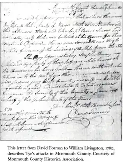Henry Muhlenberg, a German Lutheran pastor sent to the colonies as a missionary, commented on how formidable the Black Brigade was: "The worst is to be feared from the irregular troops whom the so-called Tories have assembled from various nationalities– for example, a regiment of Catholics, a regiment of Negroes, who are fitted for and inclined towards barbarities, are lack in human feeling and are familiar with every corner of the country."[9] Reports that African Americans planned massacres of whites in Elizabeth and in Somerset County inflamed the local population's fear of Tye and his men.[6] Led by David Forman, the brigadier general of the New Jersey militia, the Monmouth County Whigs organized the Association for Retaliation to protect themselves against Tye and other Loyalist raids.[3] Panicked white Patriots pleaded with Governor William Livingston to send assistance.[4] For example, David Forman wrote to Livingston detailing the extent of Tye's attacks. Livingston responded by invoking martial law. This was a catalyst that convinced more African Americans to flee to British-held New York.[2] For example, 29 male and female African Americans left slave owners in Bergen County during this time.[8] In response, Livingston and his officials encouraged slaveholders to remove their slaves to more remote parts of New Jersey.[8]