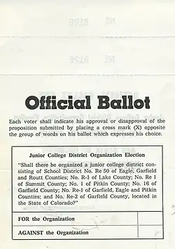 On November 2, 1965,[10] voters of five Colorado counties approved the formation of a college district including the Eagle, Garfield, Routt, Lake, Summit and Pitkin counties. The junior college plan was unanimously approved by the State Board of Education and the name "Colorado Mountain College", suggested by the governing committee member, Harold Koonce, was immediately adopted.[11]