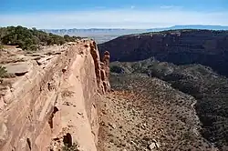 Colorado National Monument is a National Park Service unit near the city of Grand Junction, Colorado. Sheer-walled canyons cut deep into sandstone and granite–gneiss–schist rock formations. This is an area of desert land high on the Colorado Plateau, with pinyon and juniper forests on the plateau. The park hosts a wide range of wildlife, including red-tailed hawks, golden eagles, ravens, jays, desert bighorn sheep, and coyotes.[3] Activities include hiking, horseback riding, road bicycling, and scenic drives; a visitor center on the west side contains a natural history museum and gift shop. There are scenic views from trails, Rim Rock Drive, which winds along the plateau, and the campground.[4] Nearby are the Book Cliffs and the largest flat-topped mountain in the world, the Grand Mesa.