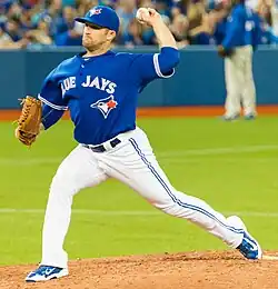 Colt Hynes pitching on his final MLB appearance game with the Toronto Blue Jays on April 18, 2015