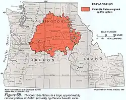 The Columbia Plateau Aquifer system is a series of layered aquifers across ~44,000 mi2 of Washington, Oregon, and Idaho. The aquifer system is on the Columbia Plateau, contained within the Cascades, Rocky Mountains, Okanogan Highlands, and the Blue Mountains.[1] These aquifers are bounded on the bottom by a layer of Miocene basaltic rock that can be up to 15,000 ft thick.[2] The primary aquifers in the system are shallow, and unconfined.[3]