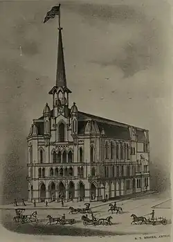 The Columbus municipal government established its first permanent offices at the Central Market, operating from its second floor from 1850 to 1872. Construction for the Capitol Square-area building began in May 1869, and the building's opening ceremony was held on March 28, 1872. The total cost, including for the property, was $175,000 to $185,000.[1][2]